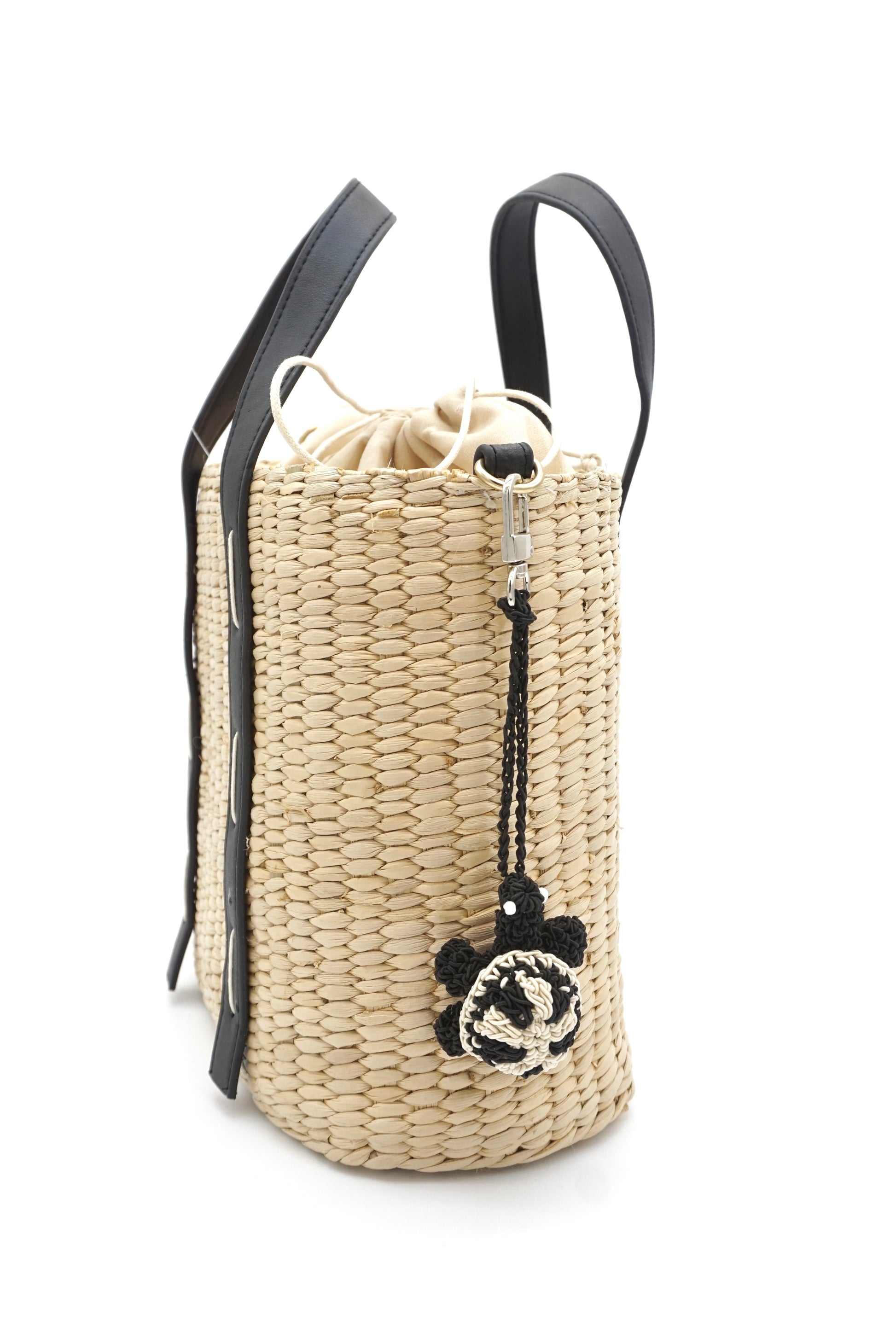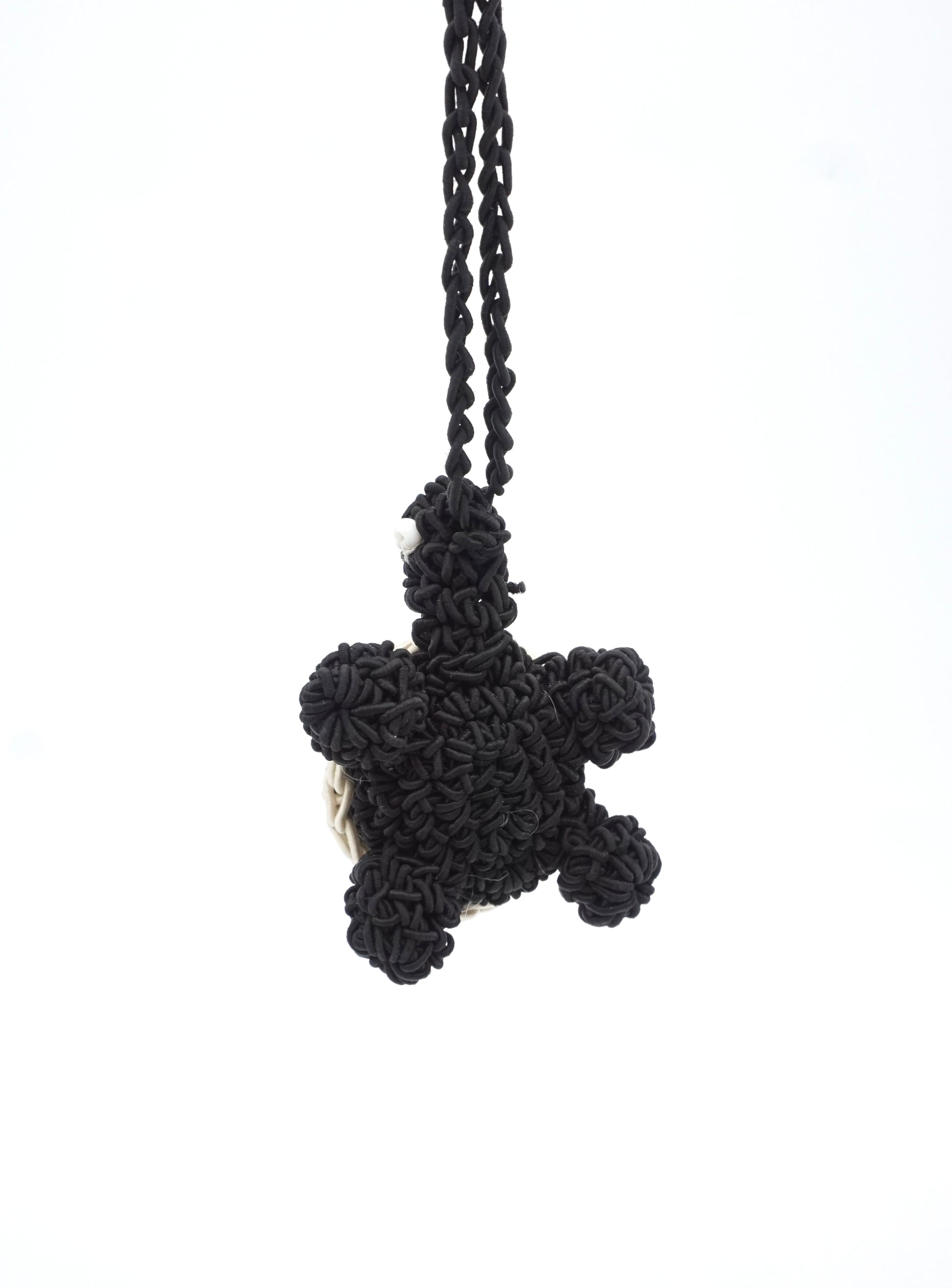 Made entirely from durable, soft paper yarn, this turtle features a rounded, checkered black-and-white shell (echoing a panda’s iconic pattern) and a tiny black head with stitched white eyes. The sturdy black braided lanyard (also paper yarn) slips easily onto bag handles or zippers, while its lightweight, airy texture blends seamlessly with straw bags and woven summer accessories.