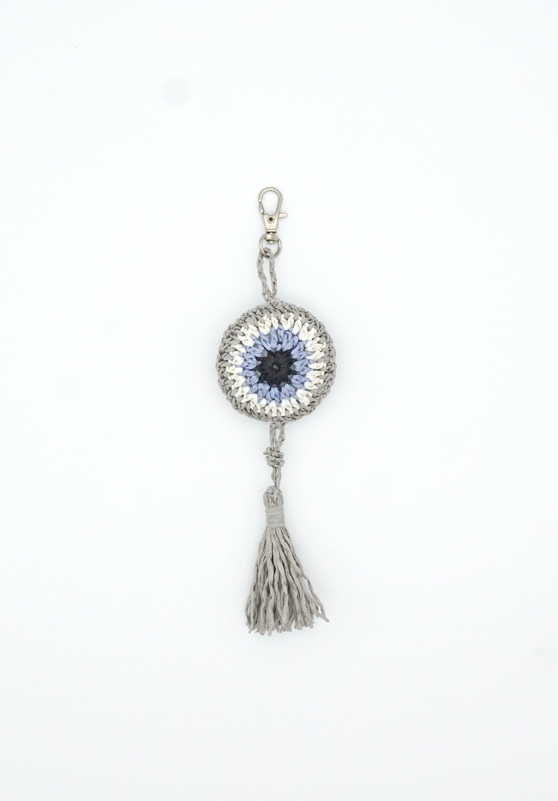 This eye-catching bag charm is handcrafted from eco-friendly paper yarn, featuring a layered evil eye design in soft shades of charcoal, periwinkle, and off-white. The circular motif is finished with a sleek, braided grey tassel, adding a touch of bohemian elegance. Its lightweight paper construction offers a gentle, textured feel, while the sturdy metal clasp makes it easy to attach to bags, keychains, or backpacks. A stylish protective symbol, it’s perfect for adding a serene, mystical vibe to your everyday accessories.