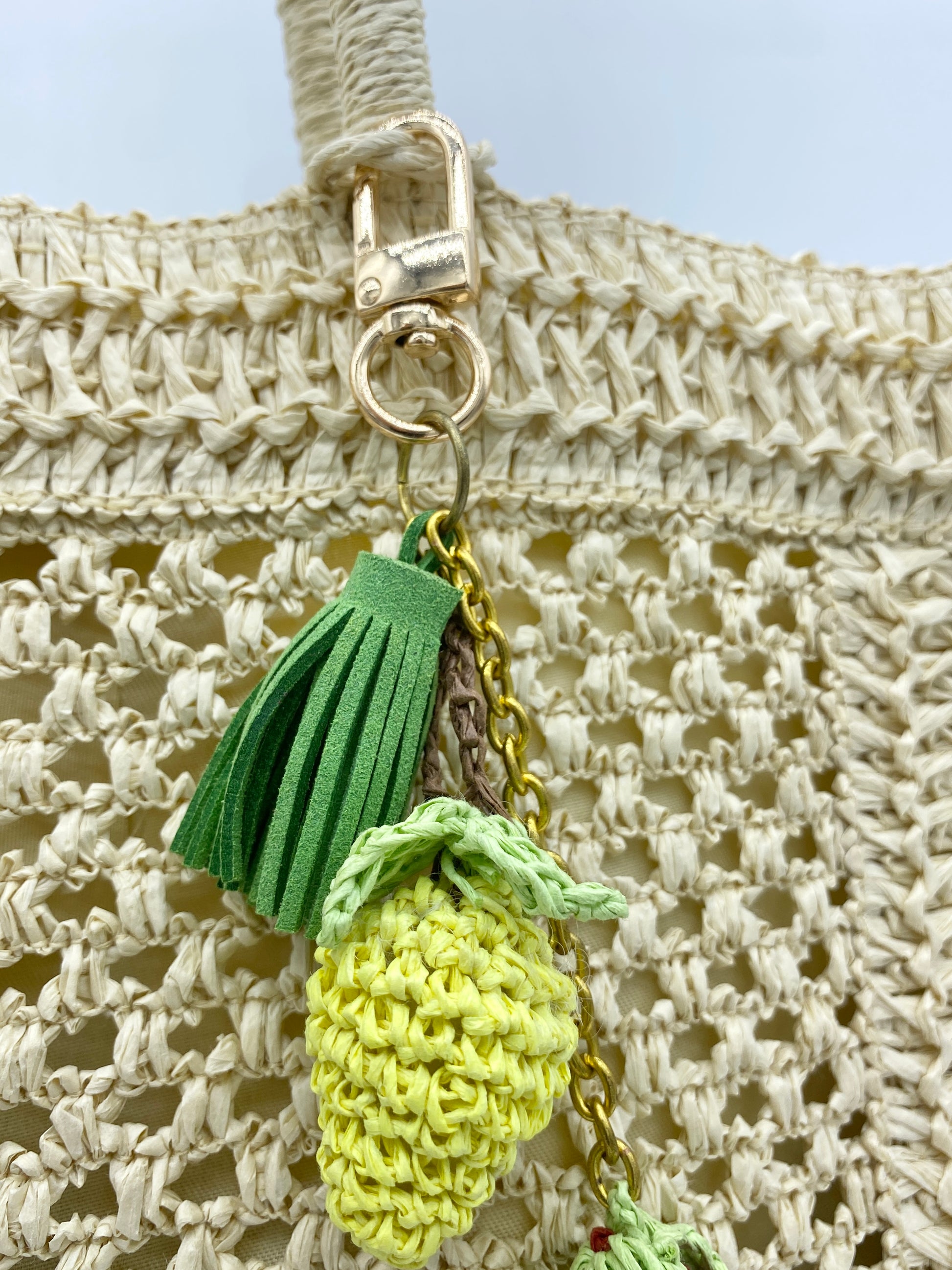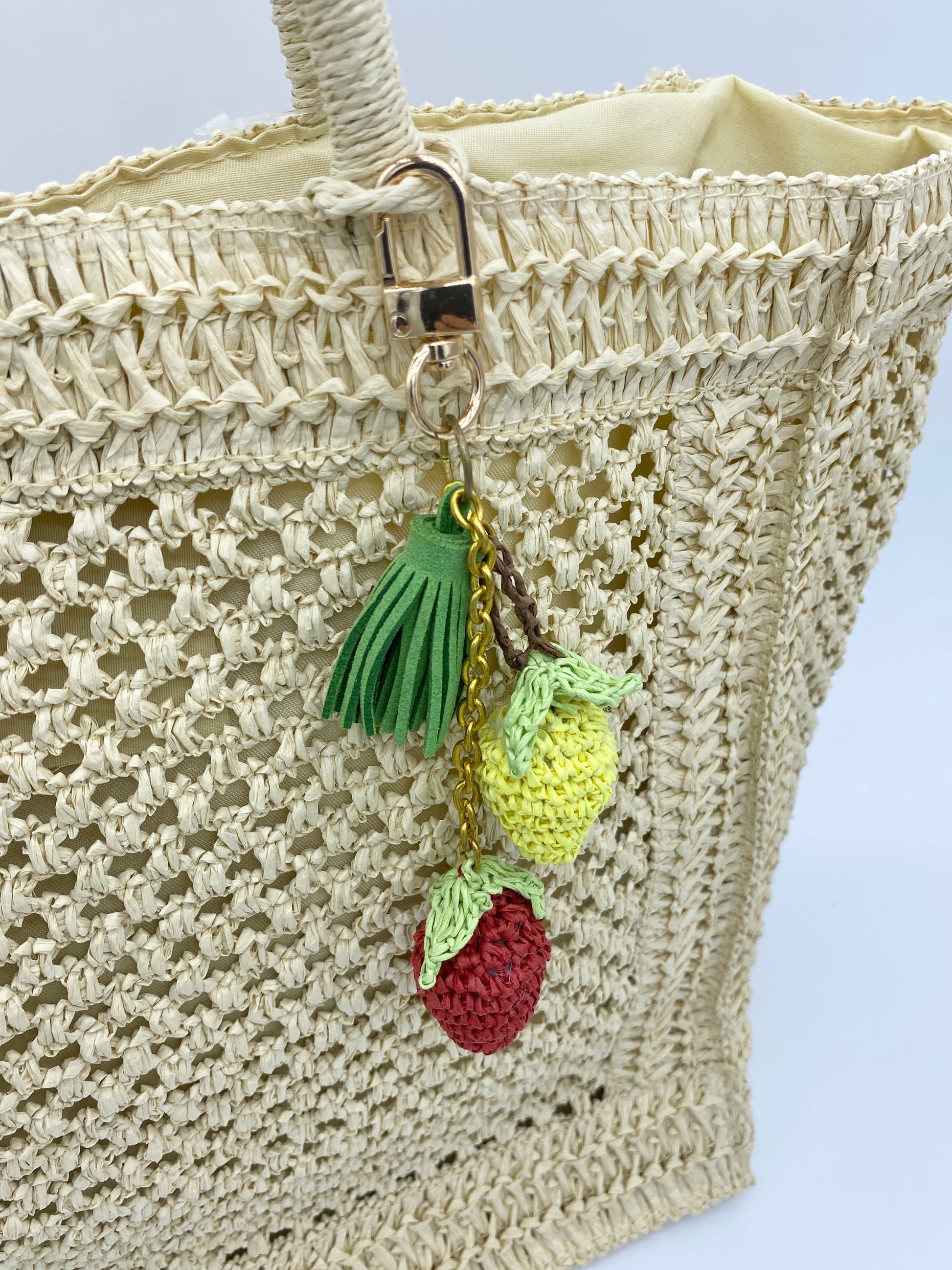 This charming bag charm is handcrafted from eco-friendly paper yarn, featuring two plump, lifelike strawberries—one sunny yellow and one rich red—each topped with a tiny crocheted green leaf. It’s finished with a soft green tassel and a sturdy metal clasp, making it easy to attach to tote bags, purses, or keychains. The lightweight paper material gives it a gentle, tactile texture, while the vibrant colors add a fresh, fruity pop to any accessory. Perfect for summer outings or adding a whimsical touch to your daily look.
